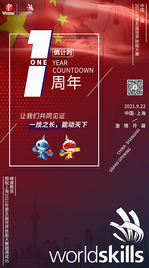 在上海2021年第46屆世界技能大賽倒計時一周年之際,唯康教育攜全體員工、全體行業(yè)合作伙伴預(yù)祝上海2021年第46屆世界技能大賽圓滿成功!更安全的歡迎世界技能大賽!更開放的讓世界技能大賽閃耀!