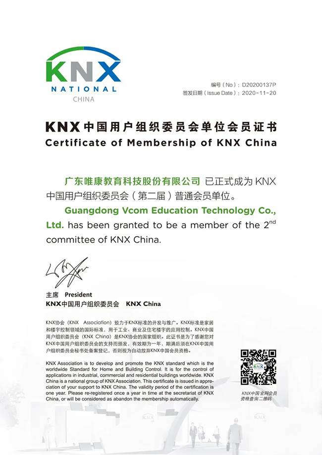2020年11月20日,廣東唯康教育科技股份有限公司正式成為KNX中國用戶組織委員會(第二屆)普通會員單位,會員編號:D20200137P。